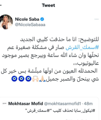 كشفت الفنانة نيكول سابا عن الأسباب الحقيقية لحذف كليبها الجديد "سمك القرش" من القناة الرسمية لها على موقع الفيديوهات يوتيوب بعد ساعات من إطلاقها رسميا، مؤكدة وجود مشكلة بسيطة فقط تعمل على حلها.