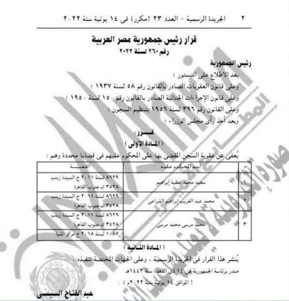 أصدر الرئيس عبدالفتاح السيسي القرار رقم 260 لسنة 2022، بالعفو عن كل من: سعيد محمد عطية إبراهيم، ومحمد عيد الغريب إبراهيم الشراعي، ومحمد مرسي محمد، في القضايا المحكوم عليهم بها.