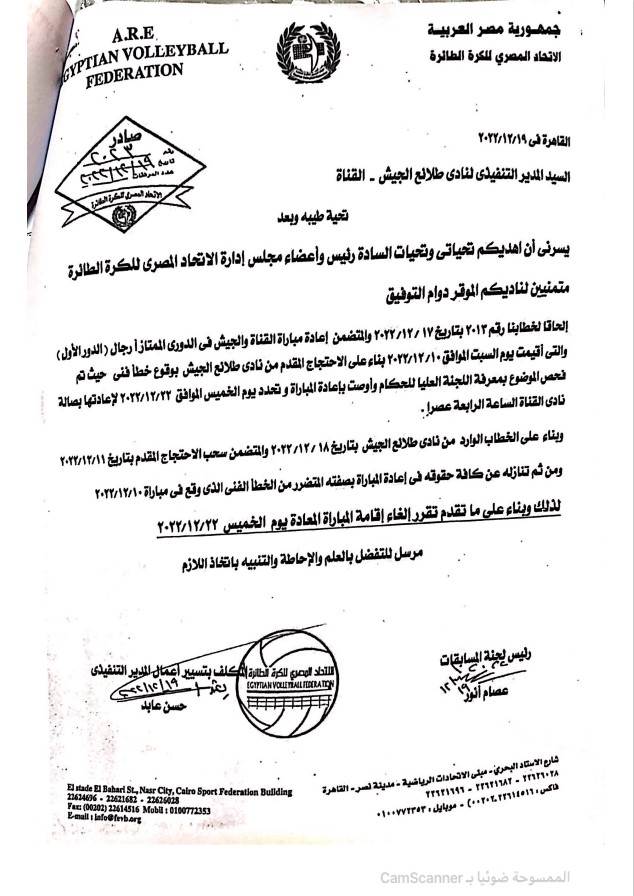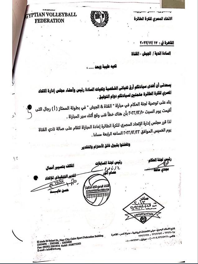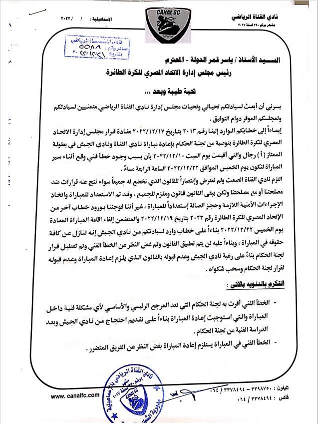تقدم مسؤولي نادي القناة بشكوى رسمية للاتحاد المصري لكرة الطائرة، طالب خلالها بالمساواة والحيادية والشفافية، وذلك في ملف مباراته مع طلائع الجيش في الدوري الممتاز أ رجال.