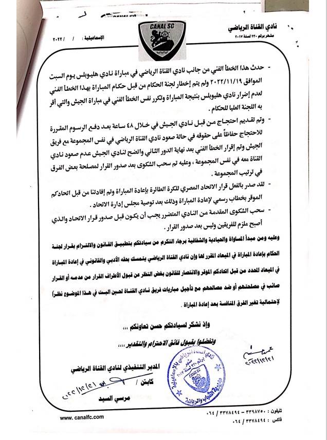 وشدد نادي القناة في خطابه على تمسكه بحقه الأدبي والقانوني في إعادة المباراة التي تقرر إعادتها، مشيرًا إلى أن قرار سحب الشكوى يجب أن يكون قبل إصدارة قرار الإعادة.