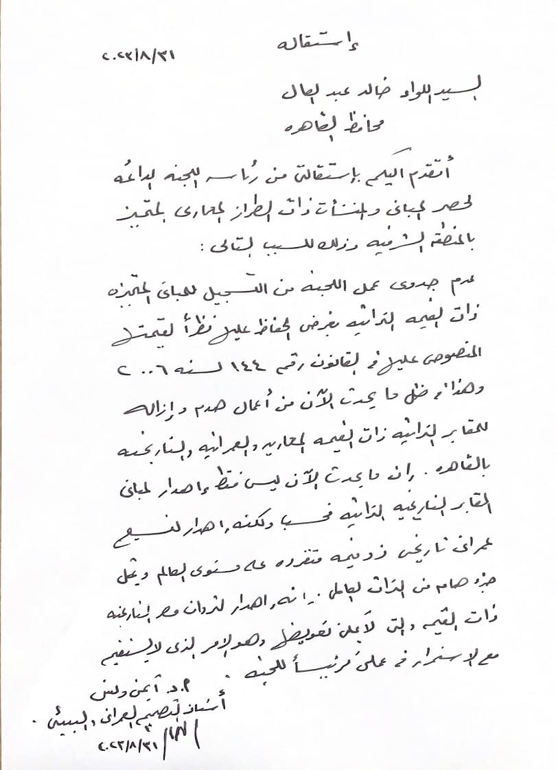 وأضاف: لكنه إهدار لنسيج عمرانی تاریخی ذو قيمة منفردة على مستوى العالم ويمثل جزء هام في التراث العالمي، هدار لثروات مصر التاريخية ذات القيم والتي لا يمكن تعويضها وهو الأمر الذى لا يستقيم مع الاستمرار في عملي كرئيساً للجنة.